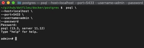 先にDockerをインストール dockerインストール - MBP(はてな)Dockerコンテナでpostgres環境を作成して ホストからpsqlで接続するpsql -U admin まで実行 Docker で作る postgres 環境 | CrudzooホストのTerminalで、 $ psql \ --host=localhost \ --port=543…