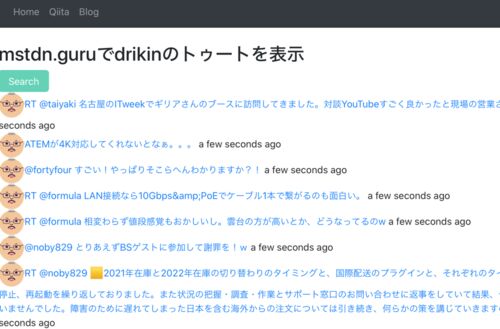 Qiitaを元に作成 ReactでQiitaAPIから記事情報を取得して表示 - MBP(はてな)タグ除去 JavaScriptでHTMLタグを削除する正規表現 - Qiita const title = item.content.replace(/<("[^"]*"|'[^']*'|[^'">])*>/g,'') <img class="css-100alwu eyfquo10" src={item.account.avatar} width="40" height="40" loading="lazy" />